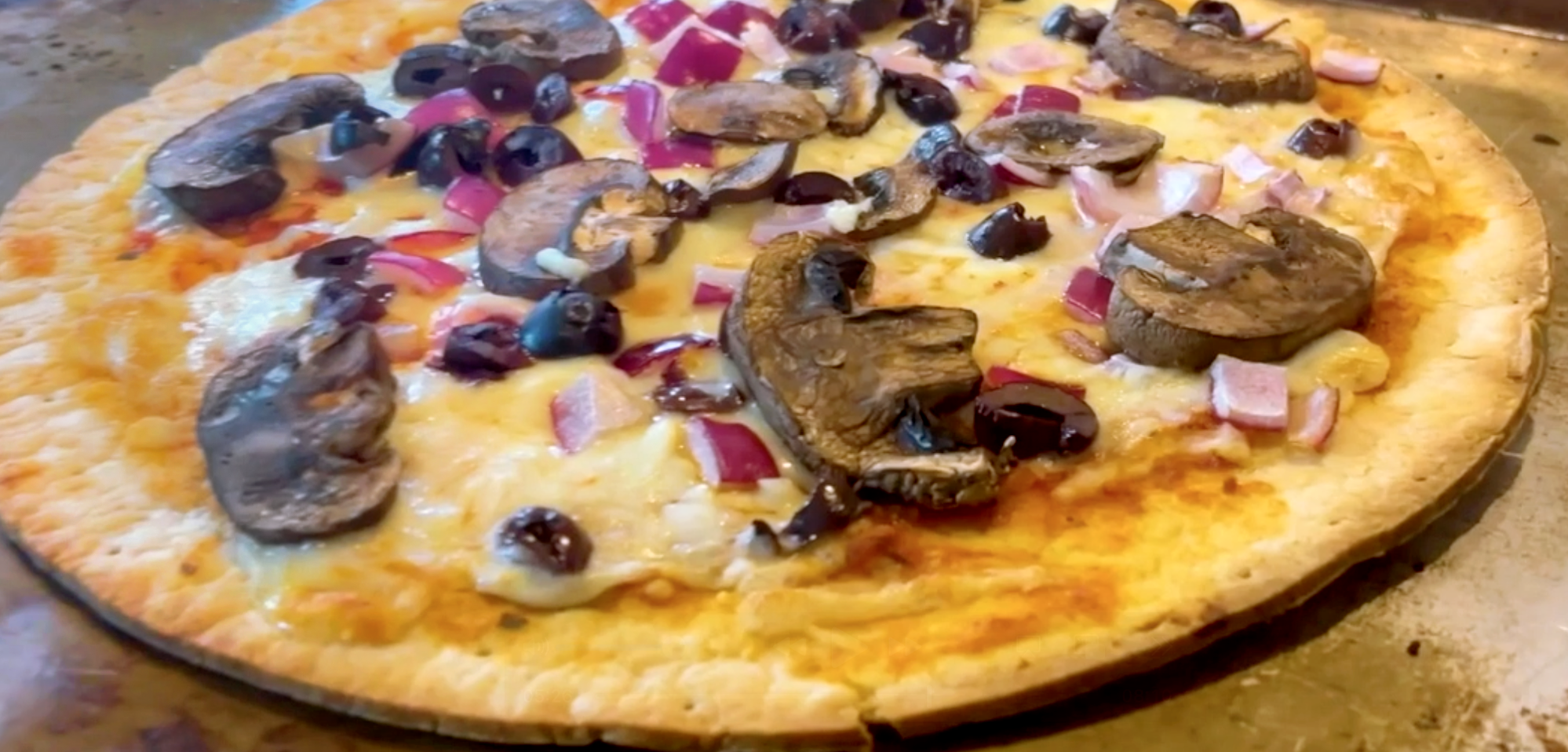 5 - Sprinkle cheese over the sauce followed by adding your onions, olives and mushrooms. Dress the toppings to your personal preference.